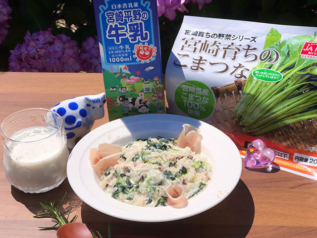 - 小松菜・牛乳・ちりめんじゃこ・チーズと、カルシウム豊富な素材のリゾットです。