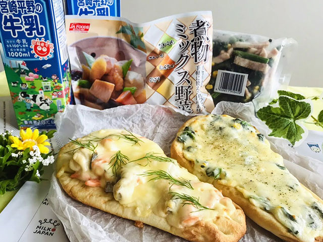 煮物ミックスとほうれん草ベーコンミックスで2種のグラタン風ピザ